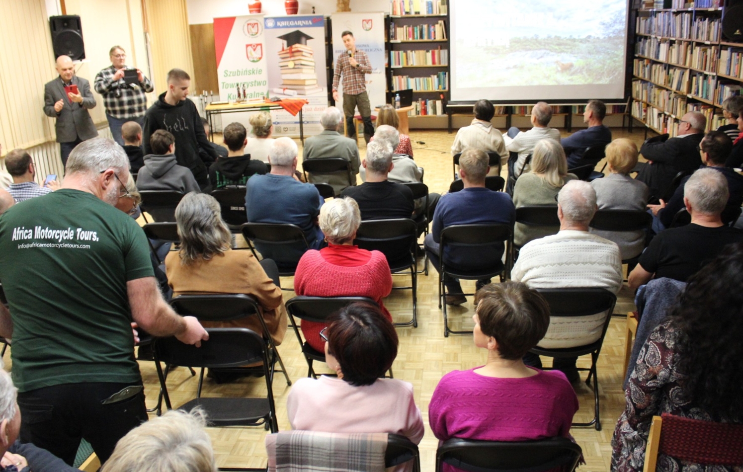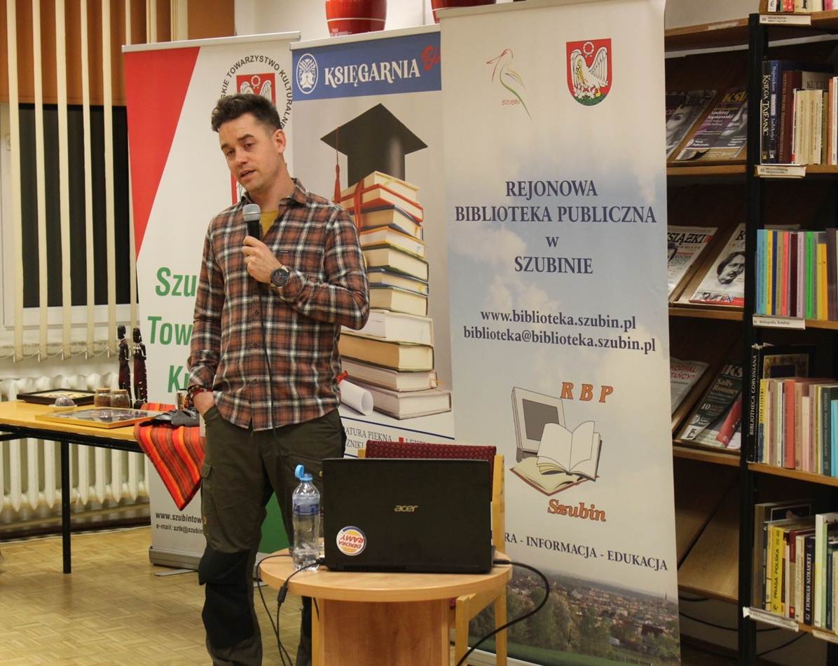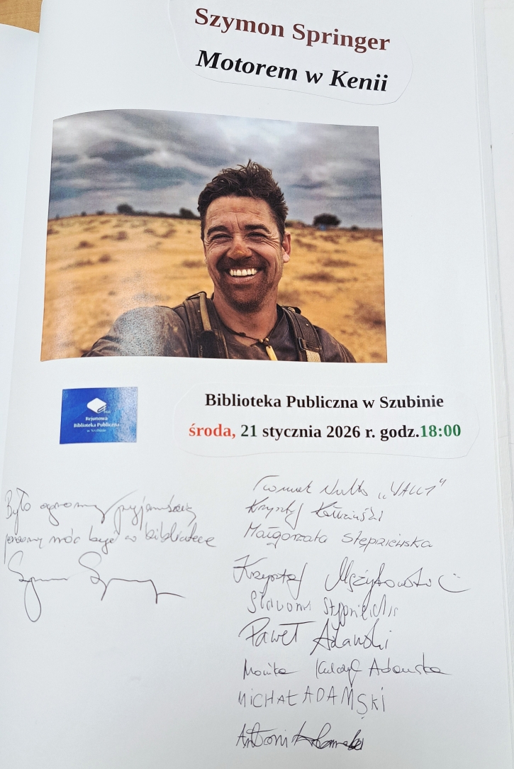 Szymon Springer znany podróżnik z Szubina tym razem zawiózł nas na motorze w serce Kenii. Wrześniowa wyprawa była czymś więcej niż śmiałym wyczynem podróżnika po Australii, Himalajach, Spitsbergenie i wielu innych egzotycznych rejonach. Szymon wszedł na wyższy poziom i od pewnego czasu organizuje wyprawy dla małych grup spragnionych prawdziwej przygody w terenie. Daleko od słynnych wczasów all inclusive. Grupa śmiałków biorąca udział w wyprawie przejechała spory obszar kraju od pustyń, sawanny po rejony uprawy herbaty, małe miasta, wsie i zupełne pustkowia. Śmiałkowie podziwiali dzikie zwierzęta na wolności, min lwy w czasie polowania, groźne hipopotamy, barwne ptaki. Był też czas na spotkania z lokalną ludnością, także ze słynnymi Masajami. Największe wrażenie na wszystkich zrobił olbrzymi park narodowy Amboseli położony u stóp góry Kilimandżaro. Spotkanie w styczniowy wieczór, było bogate w zdjęcia i krótkie filmiki. Nie musimy chyba dodawać, że czytelnia szubińskiej biblioteki była pełna po brzegi a pytania do autora spotkania nie miały końca. Dziękujemy Szymonie!